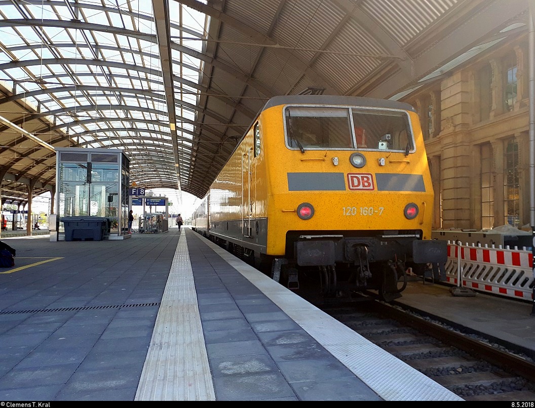 Überraschung in Halle(Saale)Hbf: 120 160-7 der DB Netz Instandhaltung mit Oberbaumesswagen und Versorgungssteuerwagen steht in Halle(Saale)Hbf auf Gleis 8. Da der Zug im nächsten Moment Richtung Süden abfuhr, reichte es nur für diesen Schnappschuss. [8.5.2018 | 15:17 Uhr]