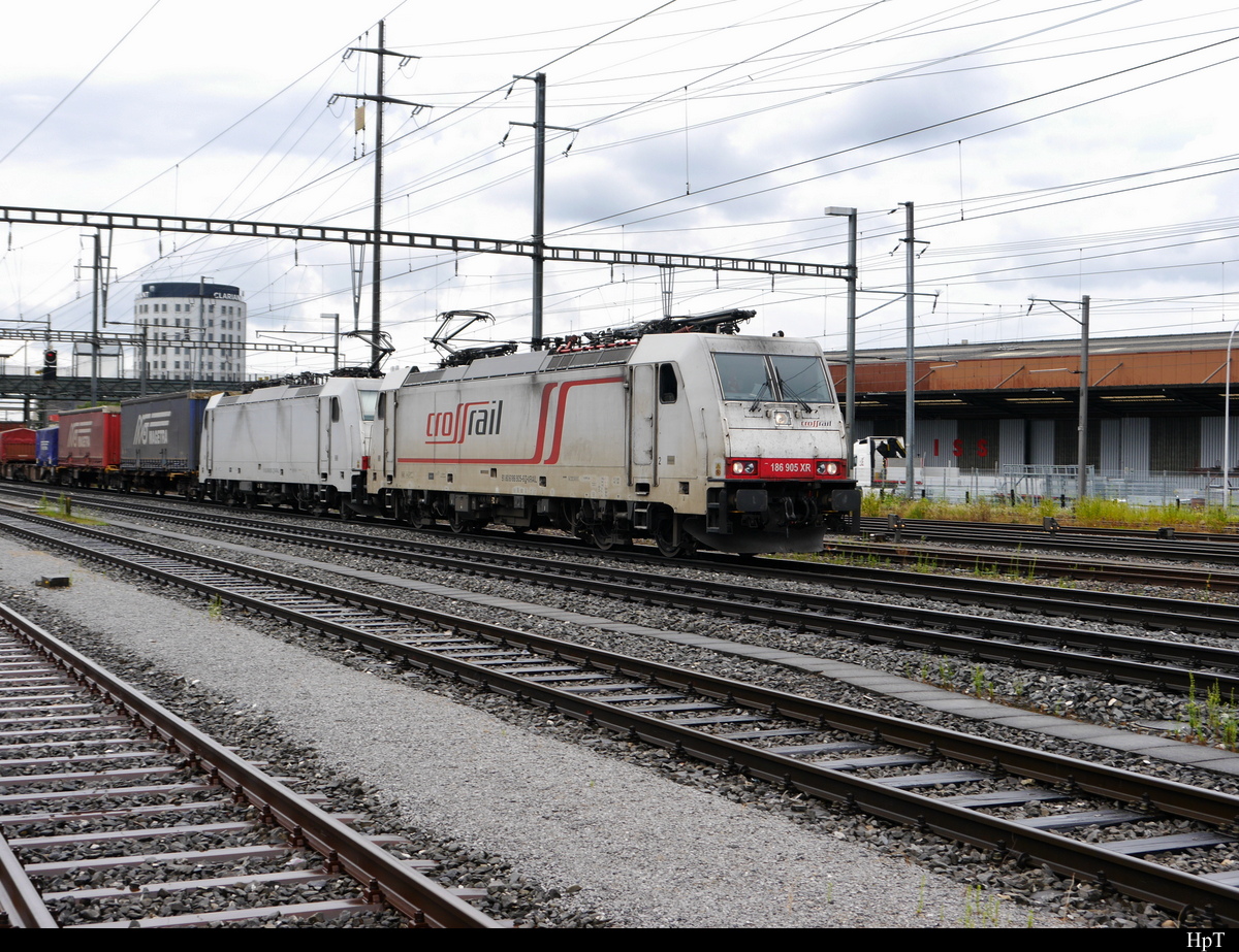 Doppeltraktion, mit den BLS Loks 465 018-0 und 465 005-7, durchfährt den Bahnhof Gelterkinden. Die Aufnahme stammt vom 31.05.2018.