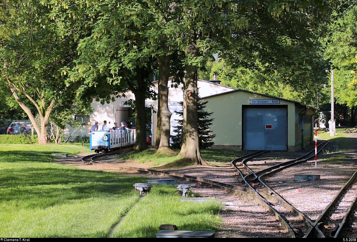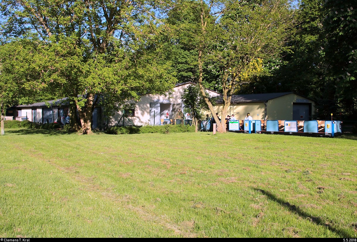 Blick auf den Lokschuppen am Bahnhof Auensee der Parkeisenbahn Auensee Leipzig mit abgestellten Personenwagen. Die Fahrten um den Auensee begannen - entgegen der Erwartungen - erst ab 19:00 Uhr. [5.5.2018 | 18:17 Uhr]