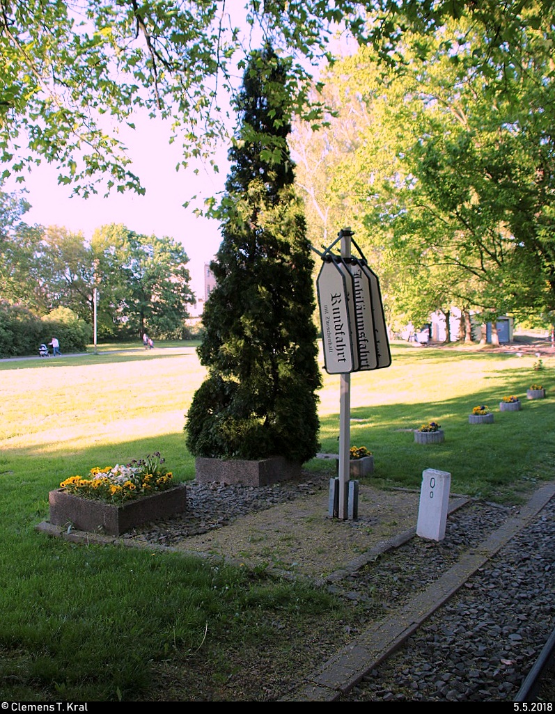Blick auf den Kilometerstein 0,0 und verschiedenen "Zugzielanzeigern" im Bahnhof Auensee der Parkeisenbahn Auensee Leipzig. [5.5.2018 | 18:25 Uhr]