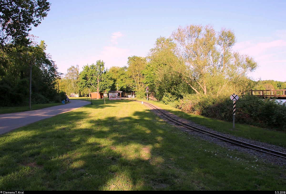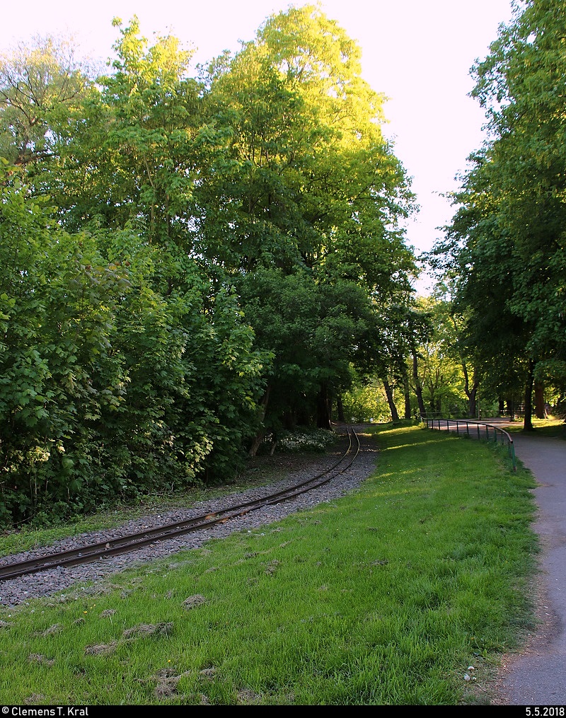 Blick auf den schattigen Streckenabschnitt zwischen dem Hp Gustav-Esche-Straße und dem Bahnhof Auensee der Parkeisenbahn Auensee Leipzig, leider noch ohne Verkehr. [5.5.2018 | 18:41 Uhr]
