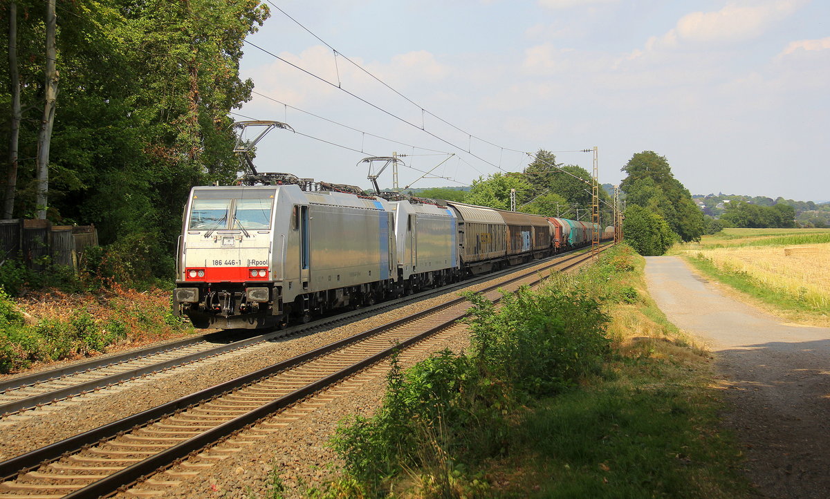 186 446-1 und 186 451-1 beide von Lineas/Railpool kommen die Gemmenicher-Rampe hochgefahren aus Richtung Aachen-West mit einem schweren gemischten Güterzug aus Köln-Gremberg nach Antwerpen-Noord(B) und fahren in Richtung Gemmenicher-Tunnel,Botzelaer(B),Gemmenich(B),Nouvelaer(B),Moresnet(B),Moresnet-Chapelle(B),Montzen(B). Aufgenommen an der Montzenroute am Gemmenicher-Weg.