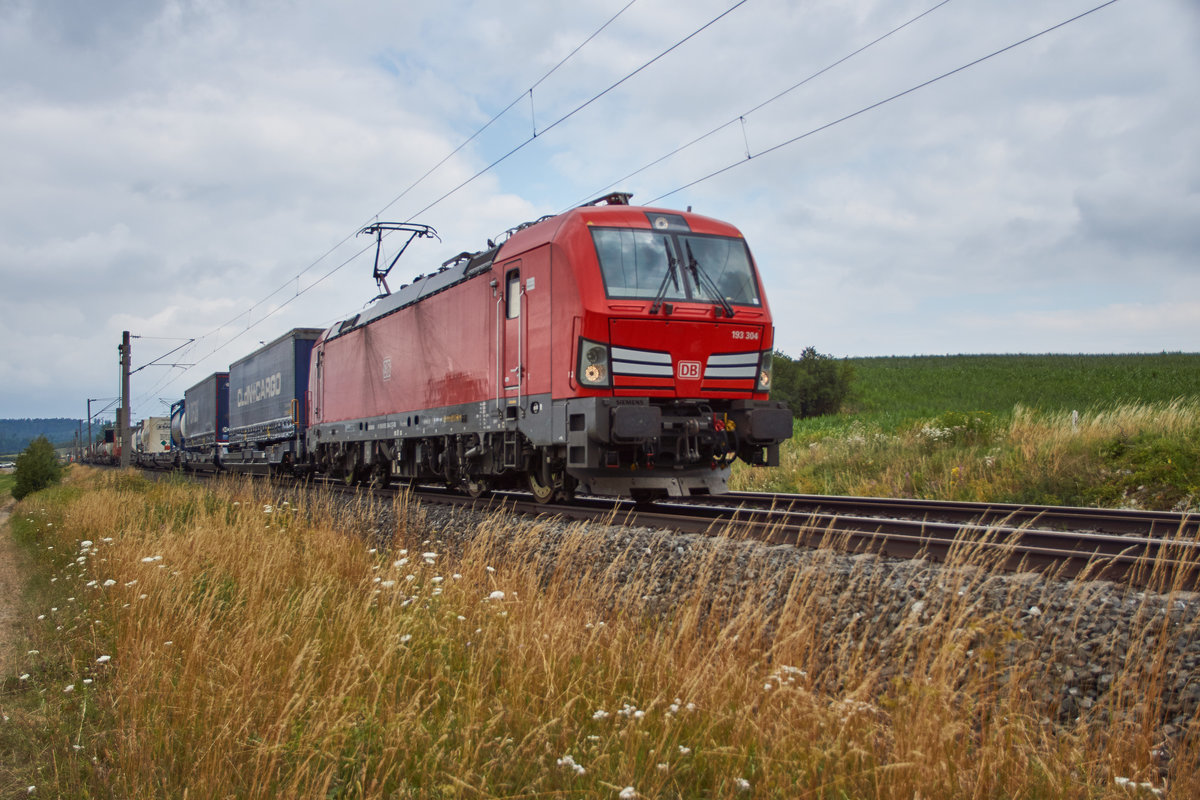 193 304 ist mit seinen Aufliegerzug am 11.07.2018 bei Dörflein in Richtung Süden unterwegs.