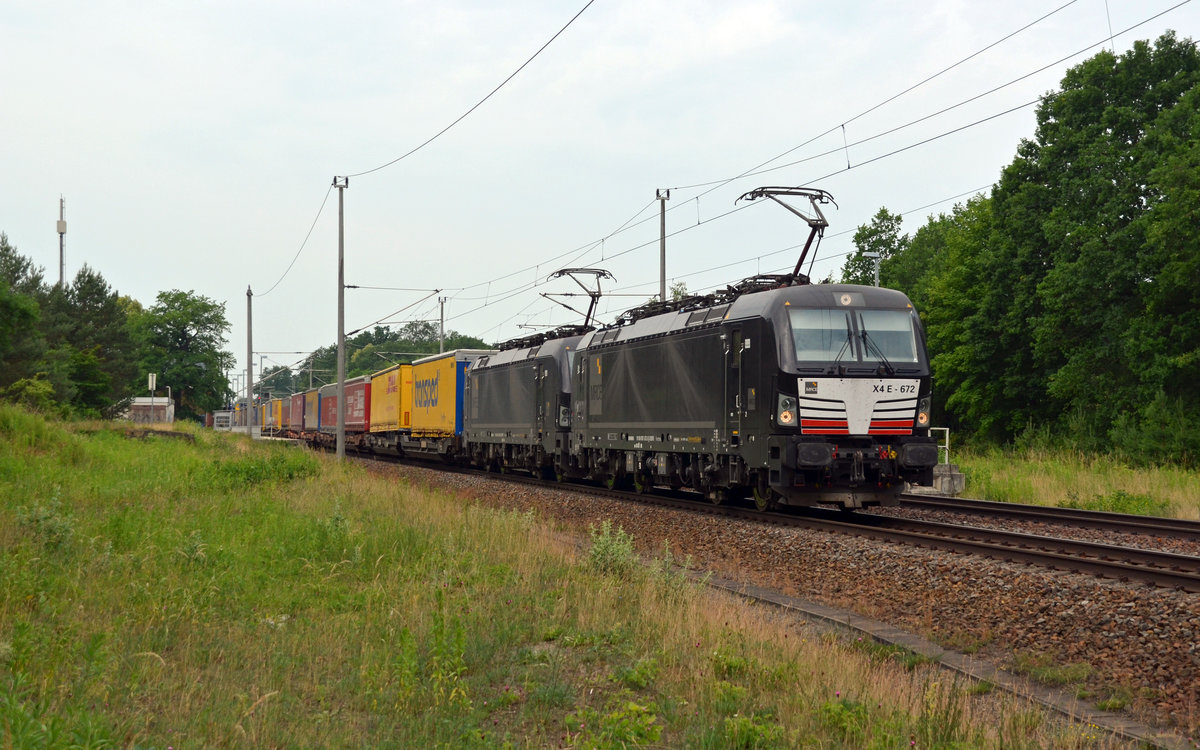 193 672 und 193 669 schleppten am 10.06.18 einen KLV-Zug für TX Logistik durch Burgkemnitz Richtung Wittenberg. Das Ziel des Zuges ist der Rostocker Hafen.