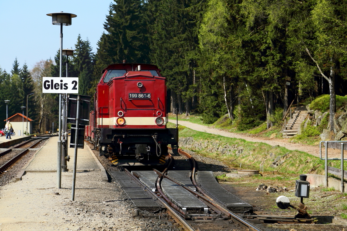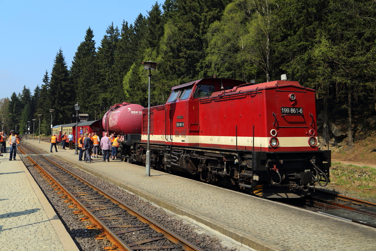 Dieses Bild zeigt 199 861 mit dem Sonder-GmP am 21.04.2018 kurz nach der Einfahrt in den Bahnhof Schierke. Da hier die Kreuzung mit P 8920 abgewartet werden muß und dies etwas länger dauert, nutzen die Fotografen die Zeit für ein paar Detailaufnahmen.