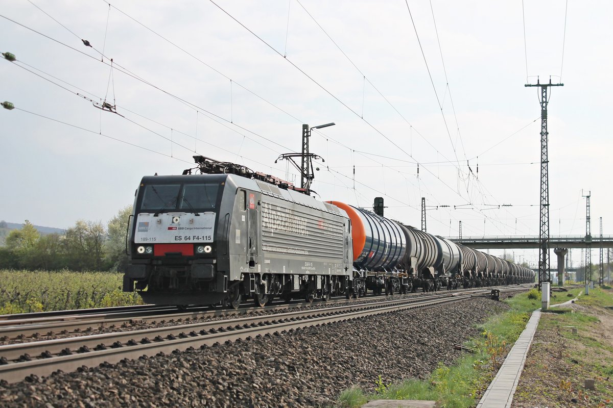 Am 05.04.2017 bespannte MRCE/SBBCI ES 64 F4-115 (189 115-9) "Alpäzähmer" einen leeren Kesselzug, als sie durch Müllheim (Baden) in Richtung Norden fuhr.