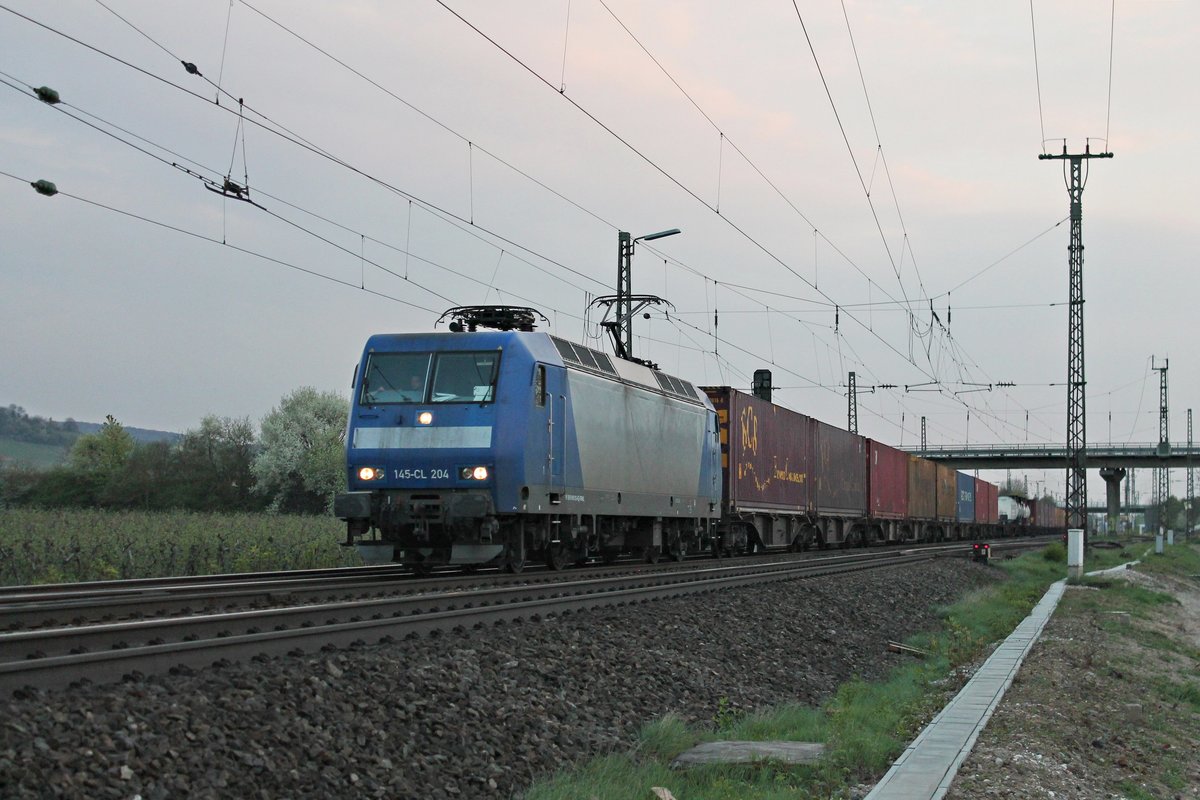 Am Abend des 04.04.2017 fuhr ATLU/XRAIL 145-CL 204 (145 100-4) mit einem Containerzug nach Belgien/Aachen West, als sie durch den Bahnhof von Müllheim (Baden) gen Freiburg (Breisgau) fuhr.