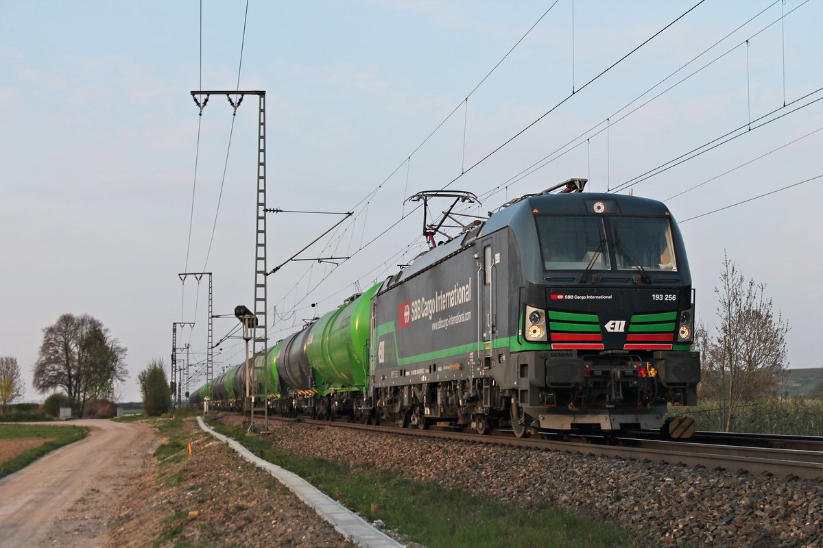 Am späten Nachmittag des 04.04.2017 fuhr ELL/SBBCI 193 256 mit einem "Kerosin"-Kesselzug (Kork - Zürich Flughafen) bei Müllheim (Baden) durchs Markgräflerland in Richtung Schweizer Grenze.