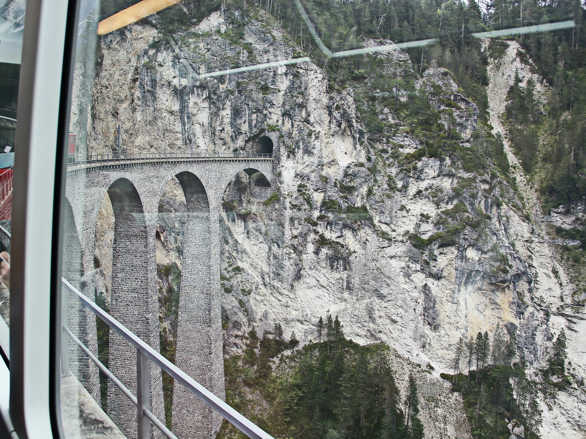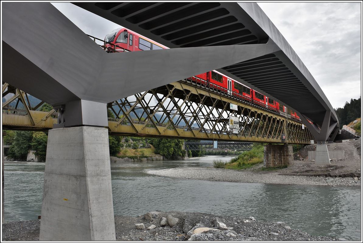 Aus der Froschperspektive zeigt sich IR1141 mit ABe 8/12 3513 auf der alten Hinterrheinbrücke. (21.07.2018)