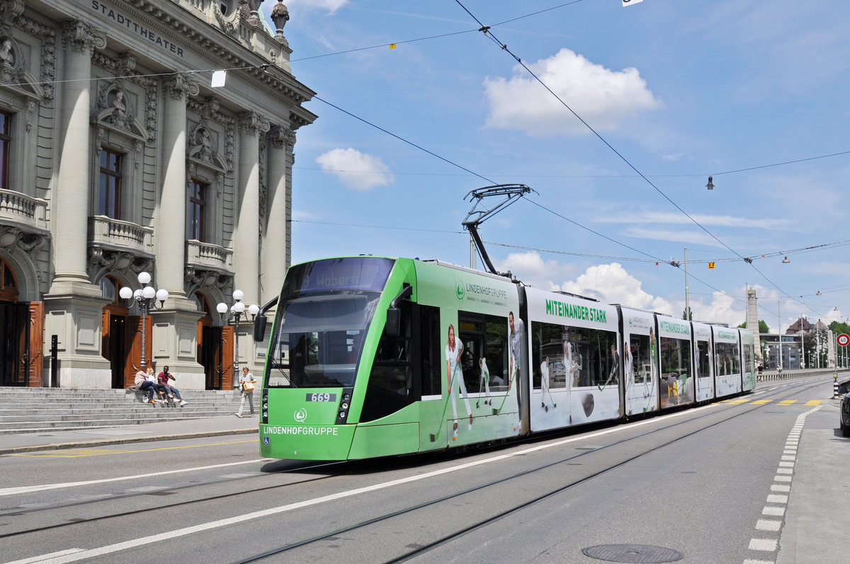 Be 6/8 Combino 669 mit einer Werbung für die Lindenhofgruppe, auf der Linie 9, fährt zur Haltestelle Zytglogge. Die Aufnahme stammt vom 22.05.2018.