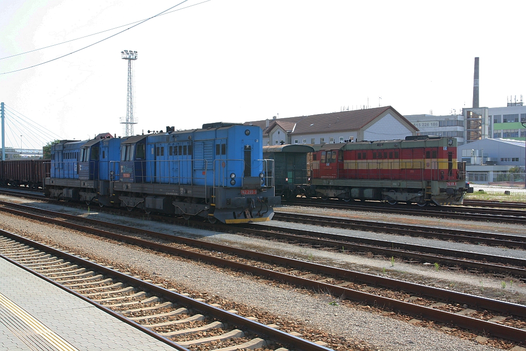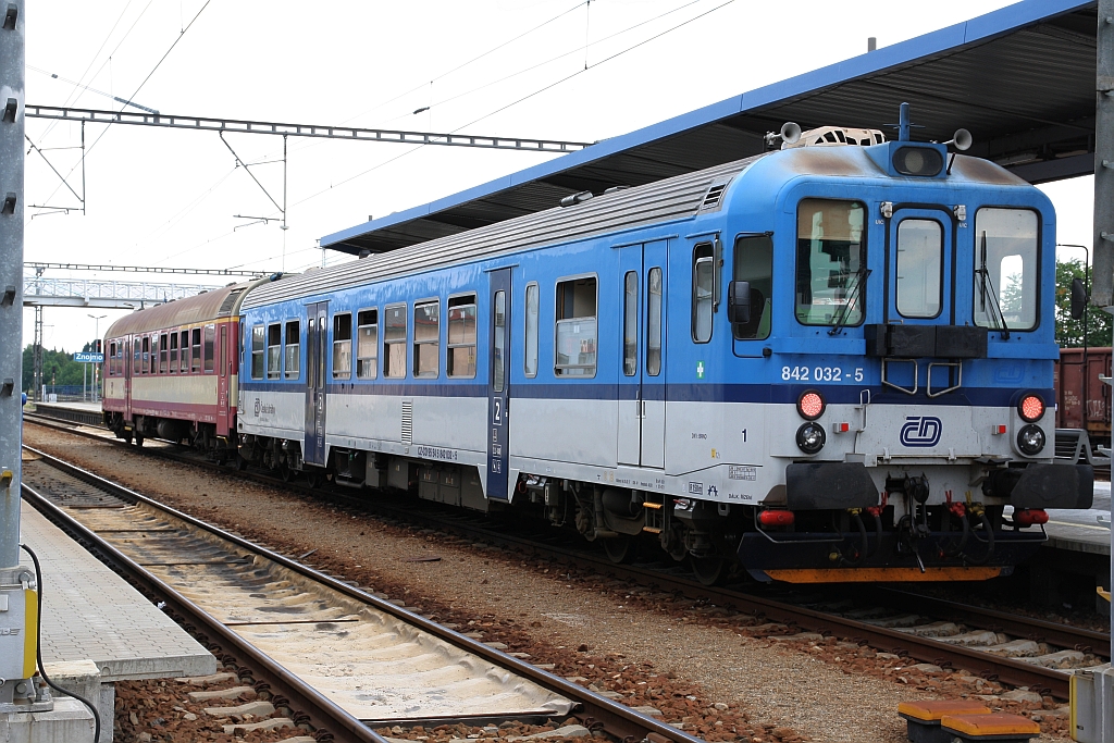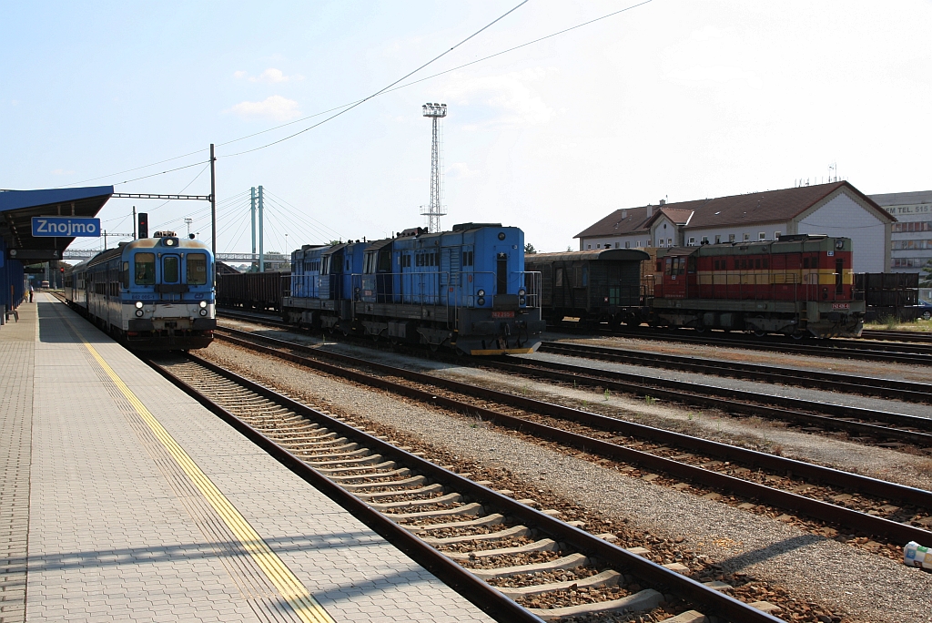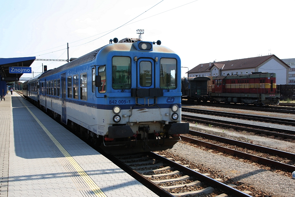 Während am 14.Juli 2018 die CDC 742 426-0 auf ihren nächsten Einsatz wartet fährt der CD 842 005-1 als SP 1822 (Brno - Satov) aus dem Bahnhof Znojmo.
