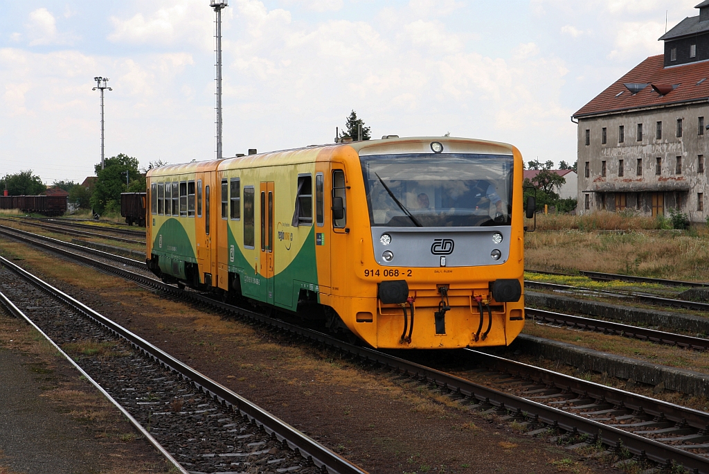 CD 914 068-2/814 068-3 fährt am 14.Juli 2018 als Os 24809 (Okrisky - Znojmo) im Bahnhof Moravske Budejovice ein.