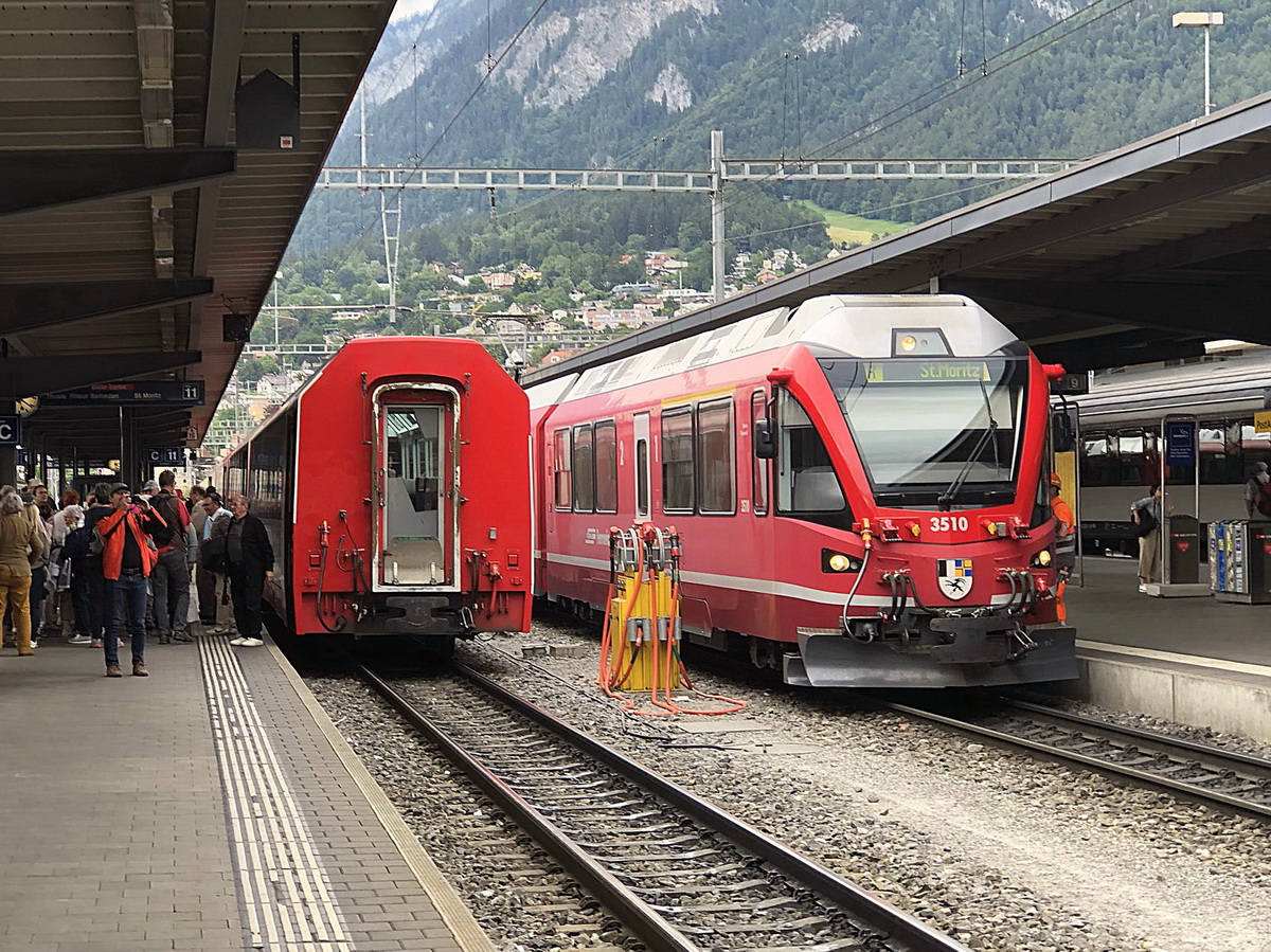 Chur am 28. Juni 2018 steht auf Gleis 12 ABe 8/12 3510 "Alberto Giacometti" zur Fahrt nach St. Moritz bereit