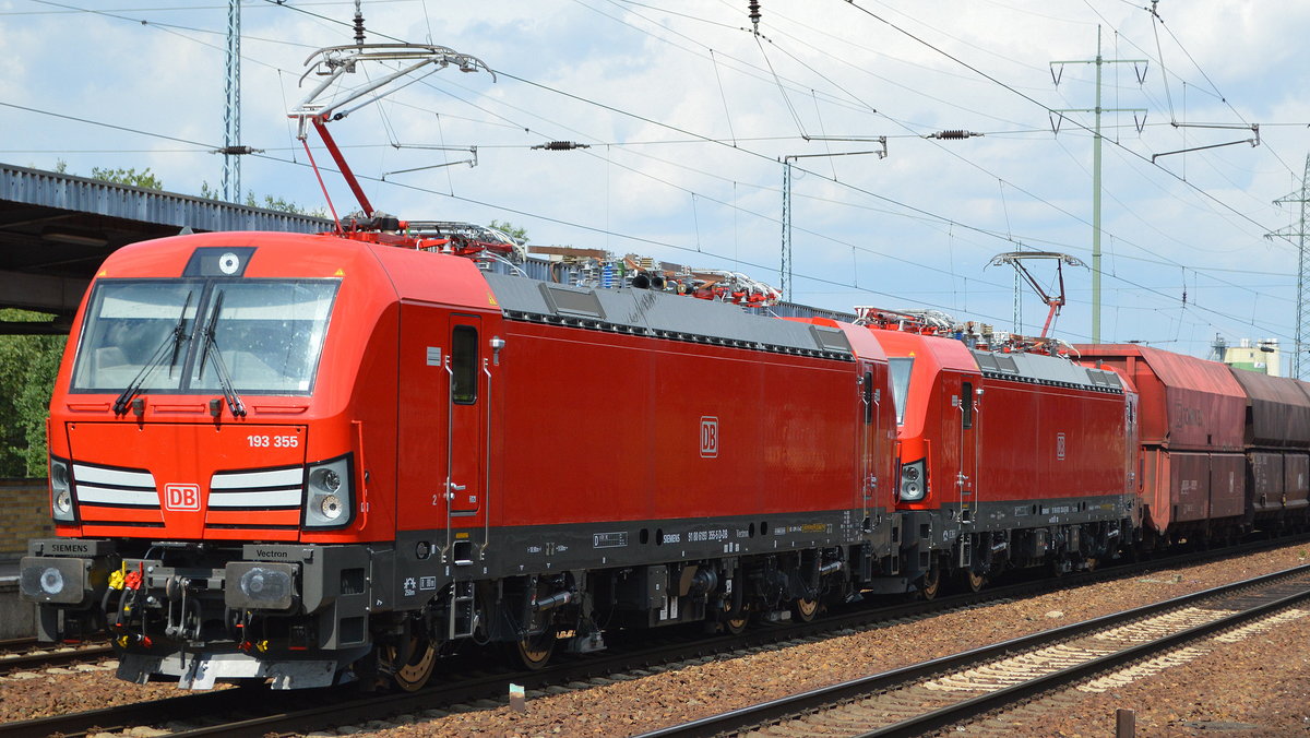 DB Cargo Deutschland AG mit der Doppeltraktion "193 355" [NVR-Number: 91 80 6193 355-5 D-DB] + "193 330" [NVR-Number: 91 80 6193 330-8 D-DB] mit Erzzug (leer) Richtung Hamburg, 17.07.18 Bf. Flughafen Berlin-Schönefeld.
