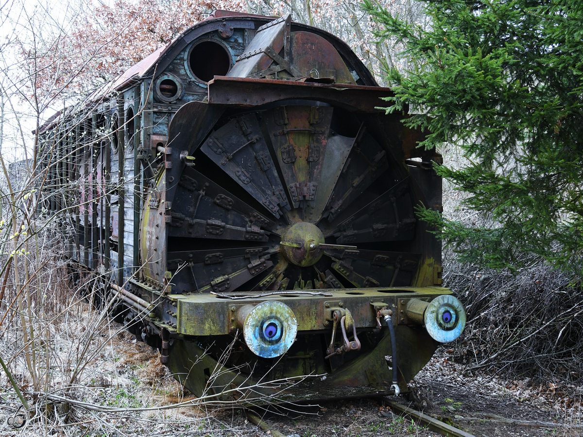 Eine restaurationsbedürftige Dampfschneefräse Anfang April 2018 im Eisenbahnmuseum Lužná u Rakovníka.