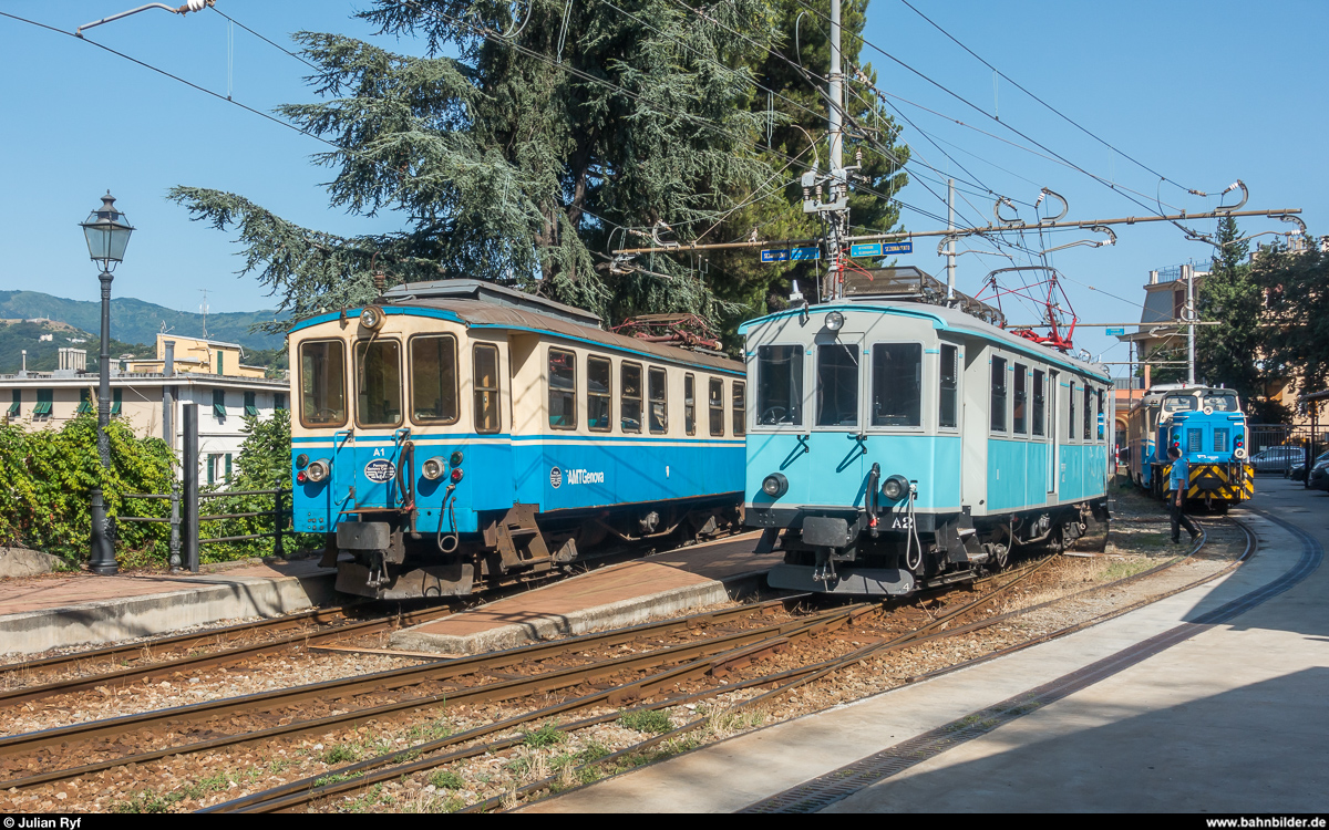 Nach dem Ende der Fotofahrt wurde der mitgeführte Güterwagen in Genova Piazza Manin wieder aufs Abstellgleis rangiert. Dabei gab es noch einmal eine Gelegenheit, die beiden Schwestertriebwagen A1 und A2 nebeneinander abzulichten. Daneben ist zudem die Diesellok D1 (ex 252 902) zu erkennen.