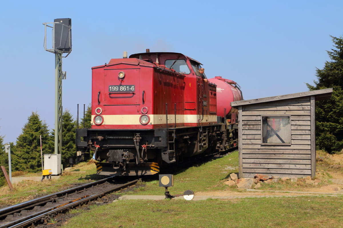 199 861 mit Sonder-GmP am 21.04.2018, kurz vor Ausfahrt nach Drei Annen Hohne, im Bahnhof Schierke.