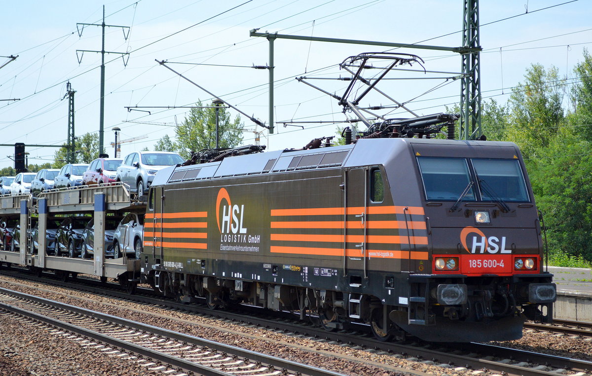 HSL Logistik GmbH mit "185 600-4" [NVR-Number: 91 80 6185 600-4 D-BRLL] und einem langen PKW-Transportzug Richtung Frankfurt/Oder am 18.07.18 Bf. Flughafen Berlin-Schönefeld.