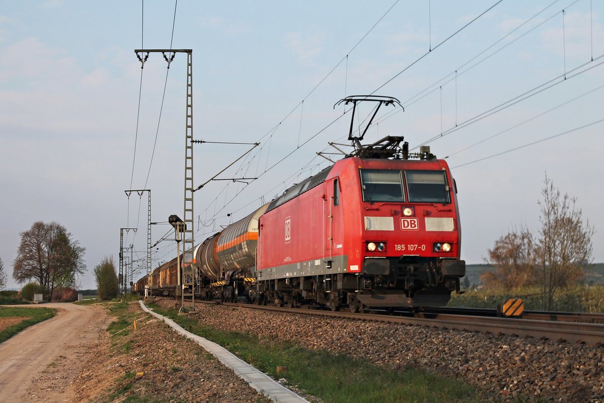 Mit einem gemischten Güterzug (Mannheim Rbf - Chiasso) fuhr am 04.04.2017 die 185 107-0 nördlich von Müllheim (Baden) in Richtung Schweiz.
