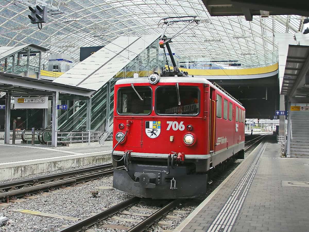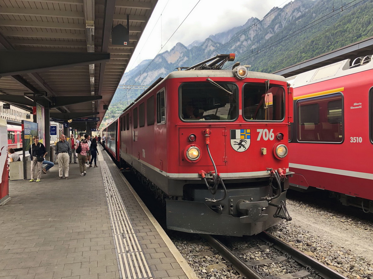 Rangierfahrt der Ge 6-6 II 706 der Räthischen Bahn für den Glacier Express in Richtung St. Moritz am 28. Juni 2018 in Chur.