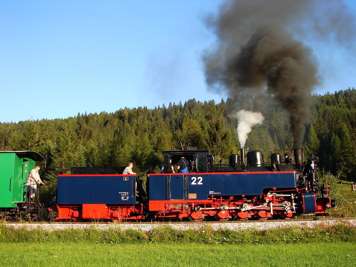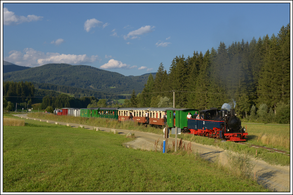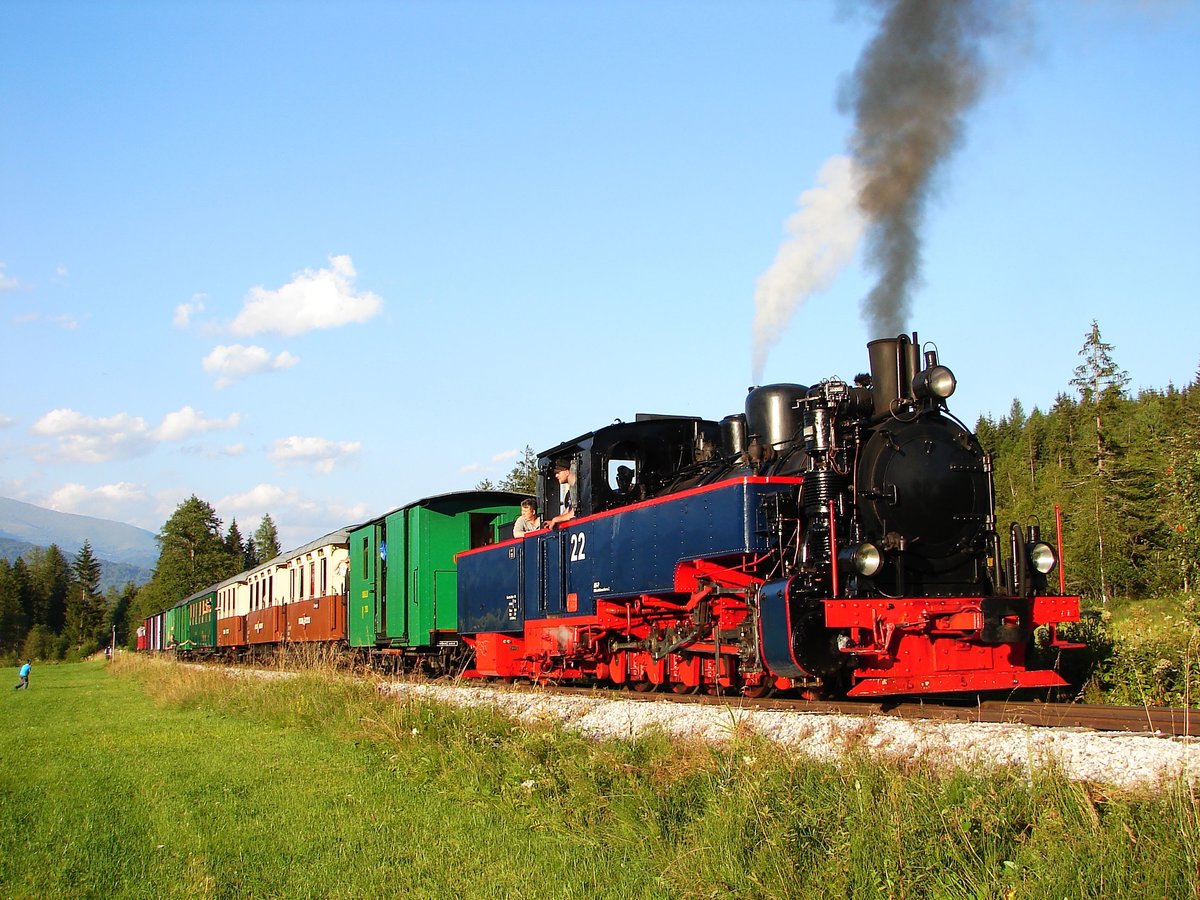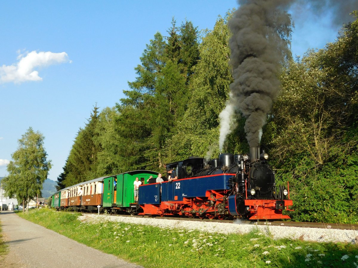 SKGLB 22 bespannte am 19.7.2018 einen Sonderzug von Mauterndorf in der Ferienregion Lungau, nach Murau und wieder retour. Die Aufnahme zeigt den Zug bei der Retourfahrt kurz nach St. Andrä im Lungau.