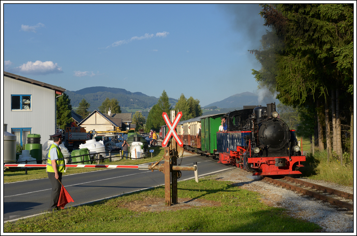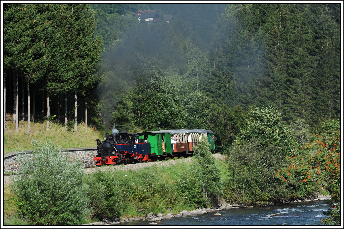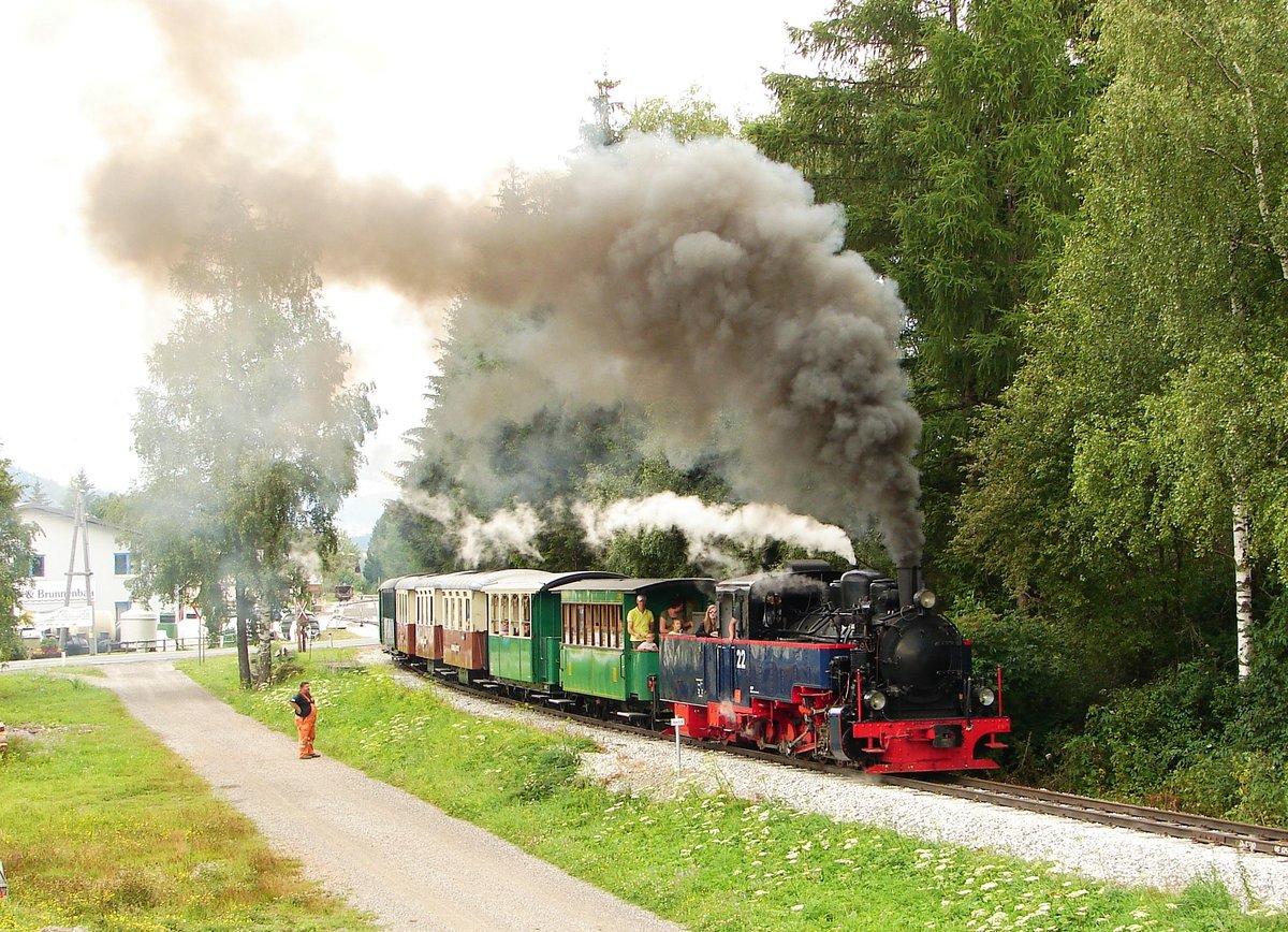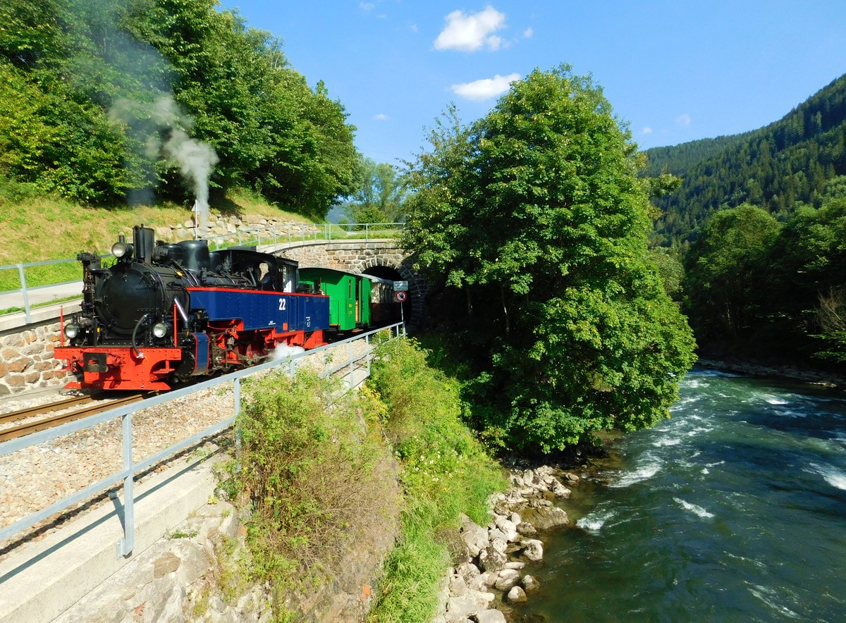 SKGLB 22 bespannte am 19.7.2018 einen Sonderzug von Mauterndorf in der Ferienregion Lungau, nach Murau und wieder retour. Die Aufnahme zeigt den Zug bei der Retourfahrt in Maria Pfarr.