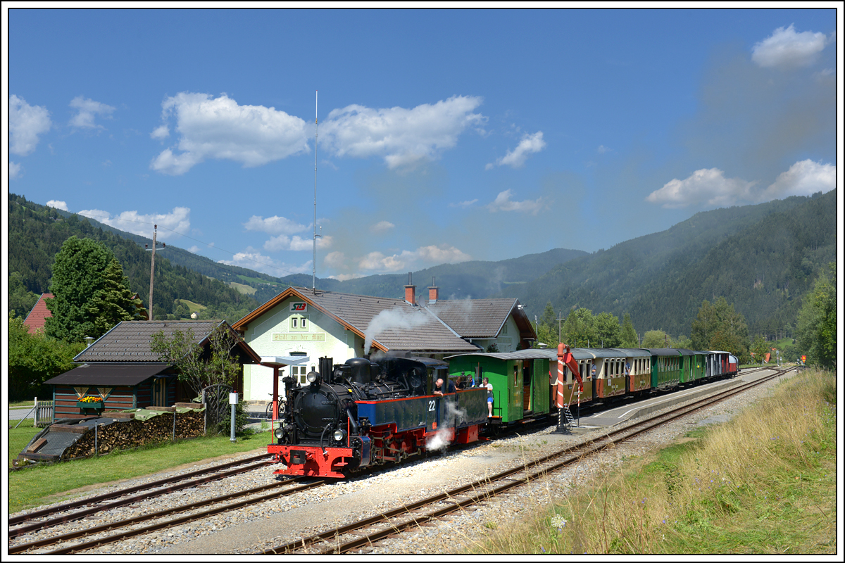 SKGLB 22 bespannte am 19.7.2018 einen Sonderzug von Mauterndorf in der Ferienregion Lungau, nach Murau und wieder retour. Die Aufnahme zeigt den Zug bei der Ausfahrt in Stadl a.d. Mur.