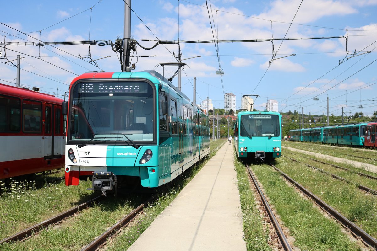 VGF Bombardier U5-25 Wagen 675 (Jubiläums Design) und Düwag U3 Wagen 452 am 07.07.18 in Frankfurt am Main bei einer Besichtigung wo man sich frei auf abgesperrten Gelände aufhalten konnte. Man konnte durch eine Anmeldung in das Betriebsgelände kommen