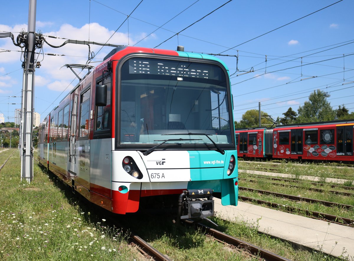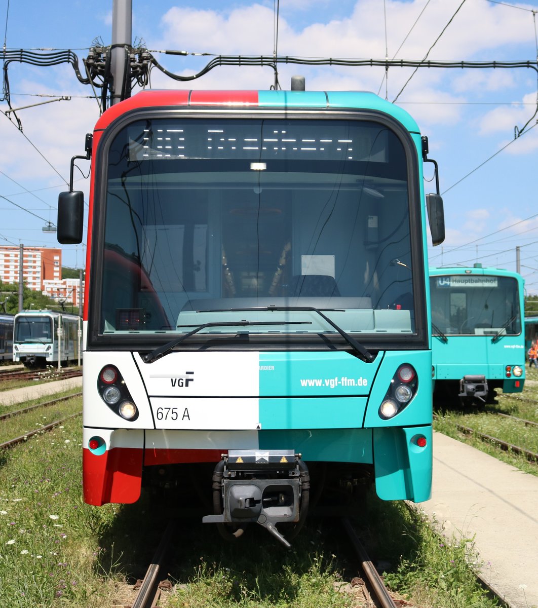 VGF Bombardier U5-25 Wagen 675 (Jubiläums Design) am 07.07.18 in Frankfurt am Main bei einer Besichtigung wo man sich frei auf abgesperrten Gelände aufhalten konnte