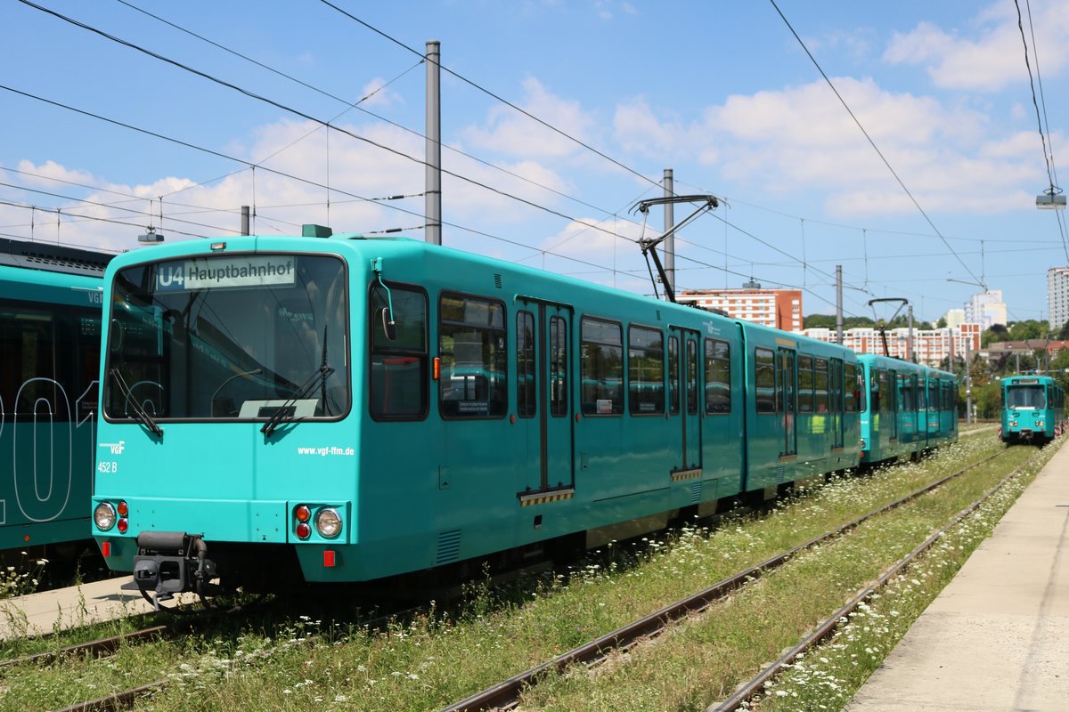 VGF Düwag U3 Wagen 452 am 07.07.18 in Frankfurt am Main bei einer Besichtigung wo man sich frei auf abgesperrten Gelände aufhalten konnte