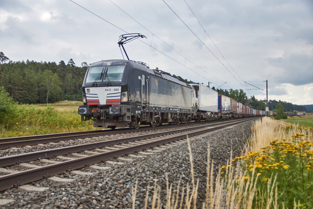 X4E -660 ist am 11.07.2018 mit einen Aufliegerzug in Richtung Würzburg bei Dörflein unterwegs.