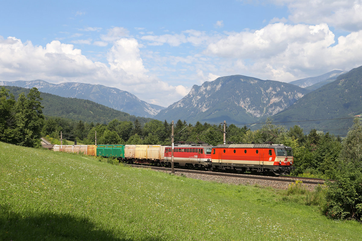 1144.117+1142.640 fahren mit G-54627 bei der Steinbauerwiese vor Rax und Schneeberg bei schöner Wolkenstimmung am Eichberg bergwärts. 25.7.18