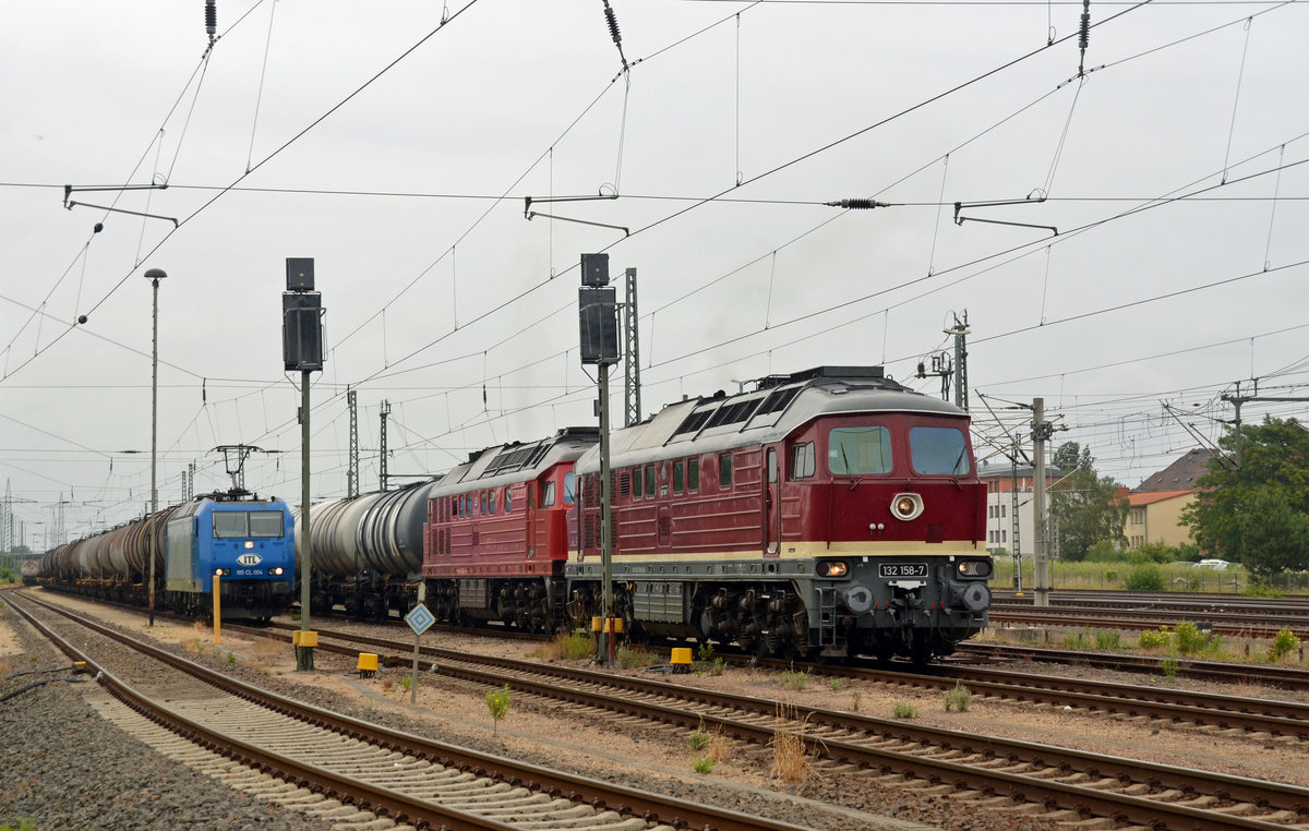 Am 24.06.18 haben sich 232 673 und 132 158 der LEG in Bitterfeld vor einen Kesselwagenzug gesetzt. Hier warten die Ludmillas auf die Ausfahrt Richtung Halle(S).