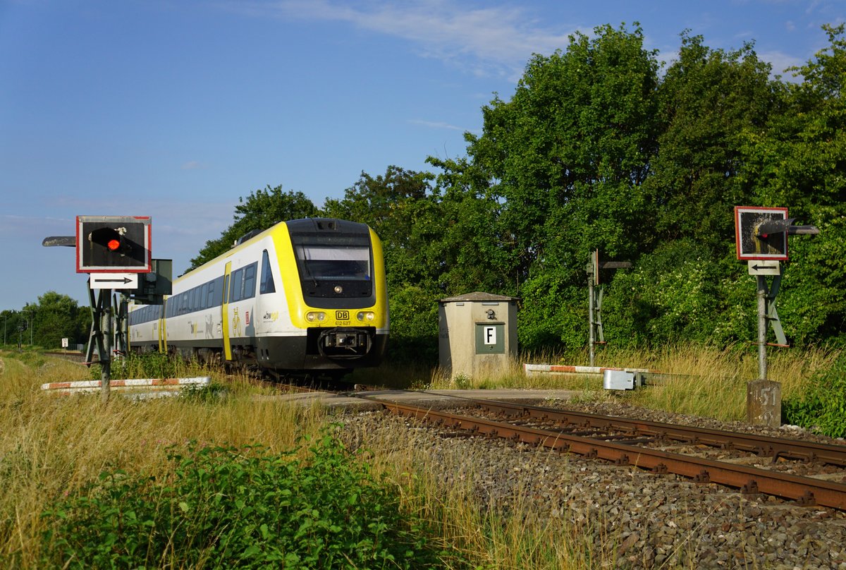 BR 612 637 "bwegt" durchfährt am 02.07.2018 bei Tübingen-Weilheim in Richtung Rottenburg einen unbeschrankten Bahnübergang.