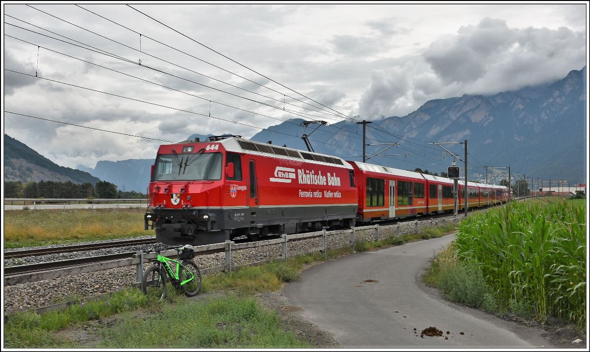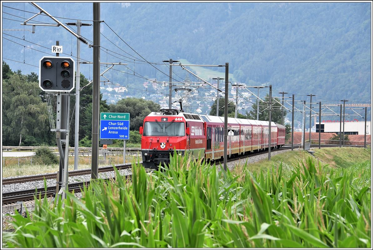 IR1145 mit Ge 4/4 III 644 "Savognin" zwischen Chur West und Felsberg. (21.07.2018)