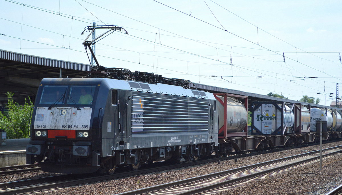 MEG - Mitteldeutsche Eisenbahn GmbH mit der MRCE "ES 64 F4-805" [NVR-Number: 91 80 6189 805-5 D-DISPO] und Containerzug Richtung Frankfurt/Oder am 18.07.18 Bf. Flughafen Berlin-Schönefeld.