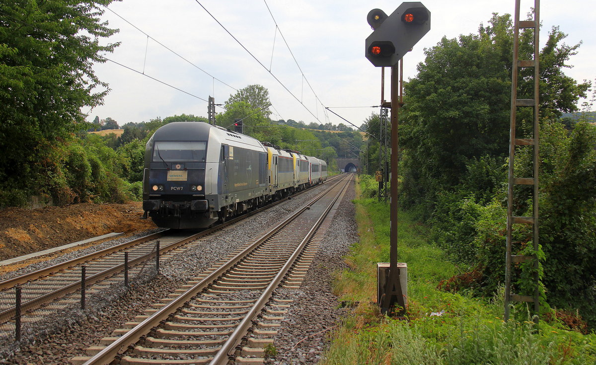 Siemens PCW7 ER20-2007 kommt mit zwei Belgischen 18er und zwei Personenwagen aus Richtung Köln und fährt durch Aachen-Eilendorf in Richtung Aachen-Hbf.