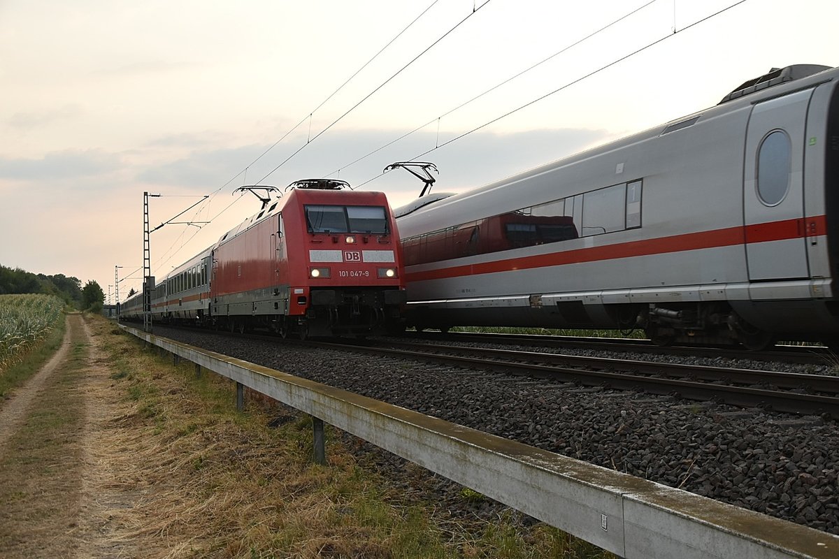 Zugbegenung eines ICE nach Amsterdam Centraal und dem aus Rheydt kommenden ex IC 2223 der wegen einer Baustelle zwischen Erkelenz und Geilenkirchen zur Zeit in Rheydt endet und hier auf dem Weg nach Köln in die Abstellung ist. Gubberath den 25.7.2018