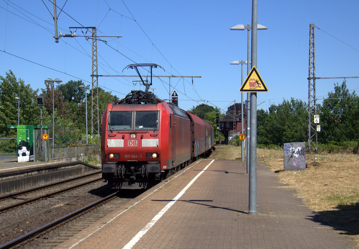 185 144-3 DB kommt aus Richtung Mönchengladbach-Hbf mit einem Güterzug aus Ruhrgebiet nach Köln-Gremberg(D) und fährt durch den Rheydter-Hbf in Richtung Grevenbroich,Köln. Aufgenommen vom Bahnsteig 3 in Rheydt-Hbf. Bei Sommerwetter am Mittag vom 1.7.2018.
