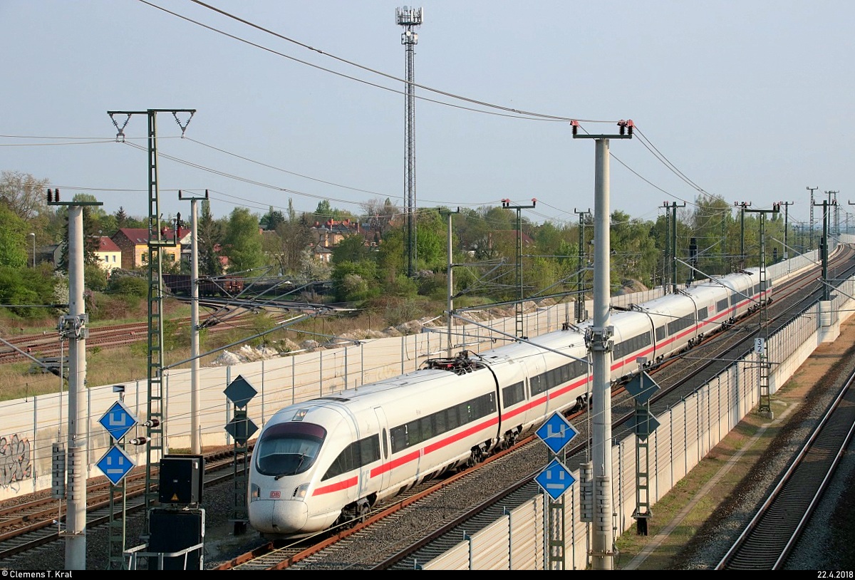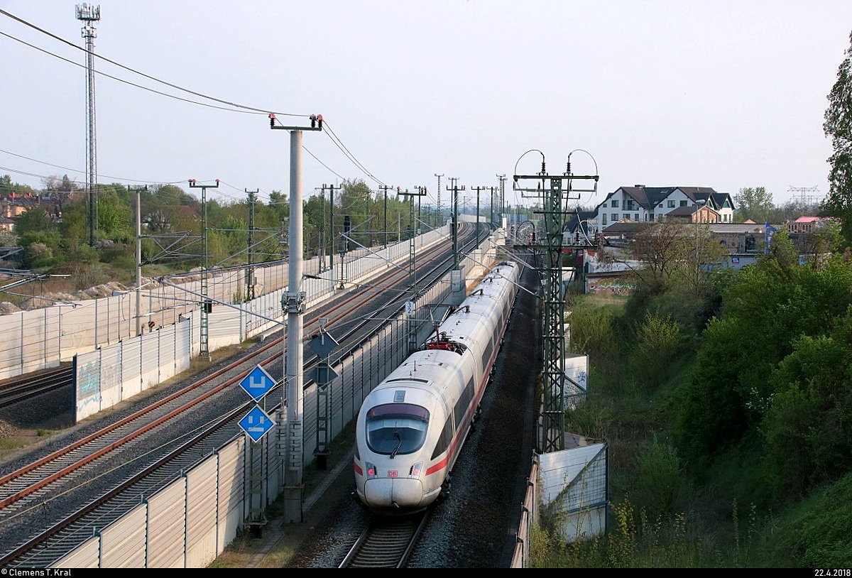 Auf Abwegen: 411 569 (Tz 1169) als unbekannter ICE fährt in Halle-Ammendorf abweichend auf der Bahnstrecke Halle–Bebra (KBS 580) und zweigt nicht auf die Neubaustrecke Erfurt–Leipzig/Halle (KBS 580) ab. Aufgenommen von der Brücke Hohe Straße. [22.4.2018 | 17:58 Uhr]