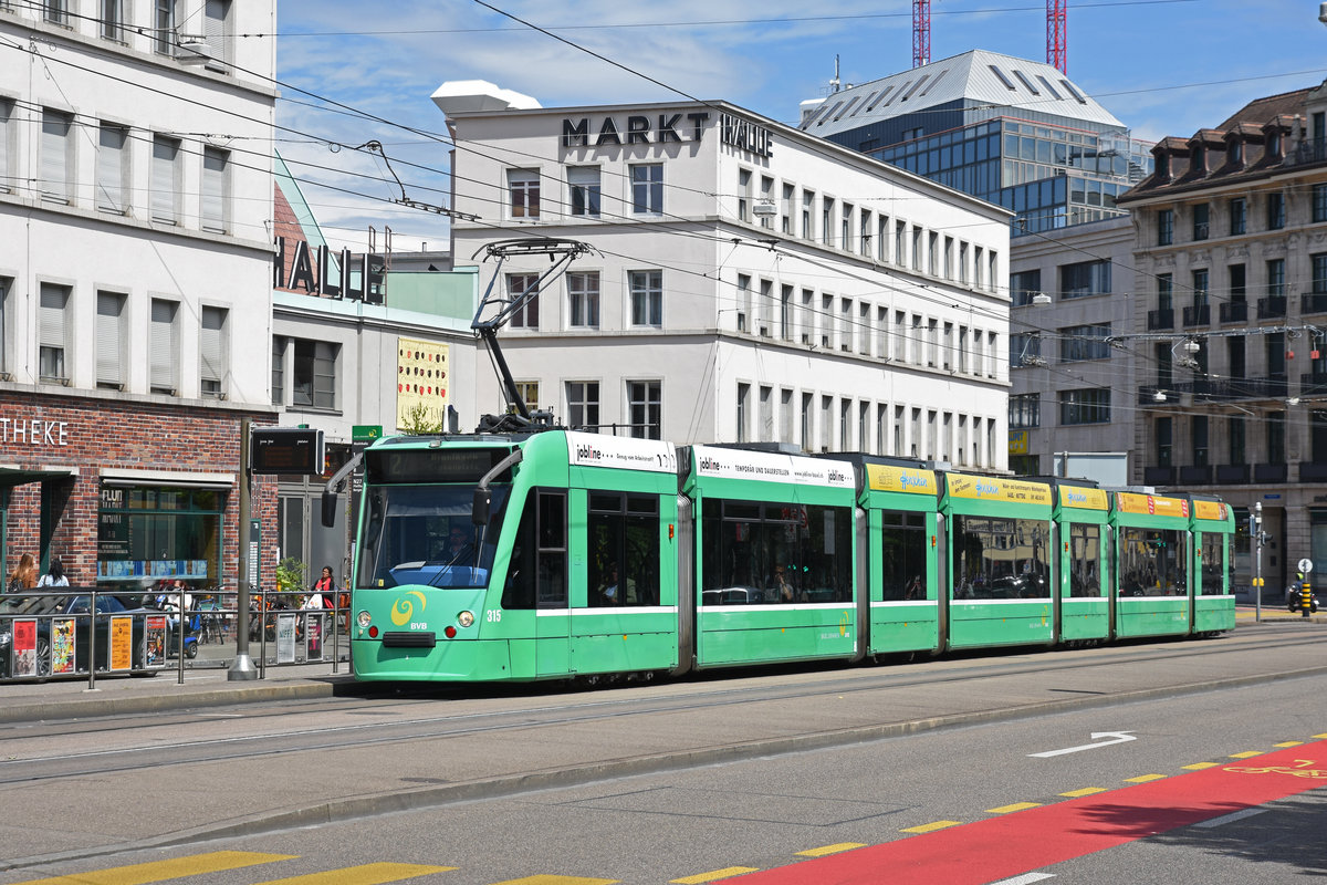 Be 6/8 Combino 315, auf der Linie 2, fährt zur Haltestelle Markthalle. Die Aufnahme stammt vom 24.06.2018.