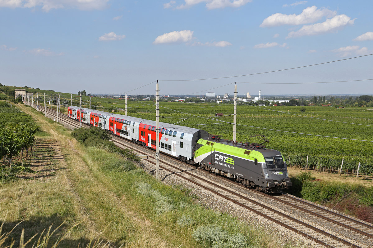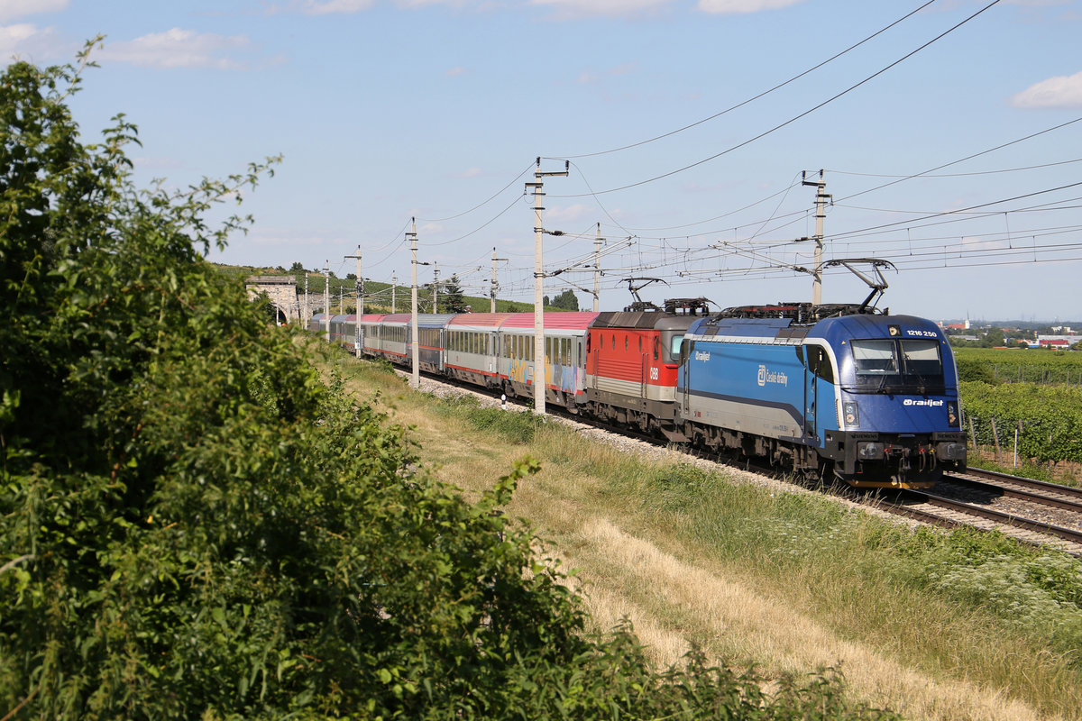 Merkwürdige Bespannung am EC-159 durch 1216.250+1144.208 der anfang Juli durch die Weinberge rund um Pfaffstätten fährt.