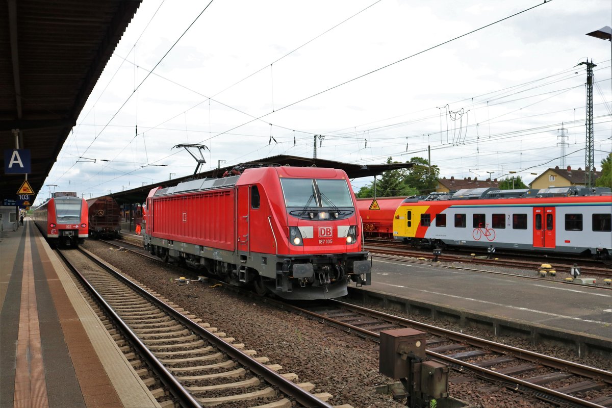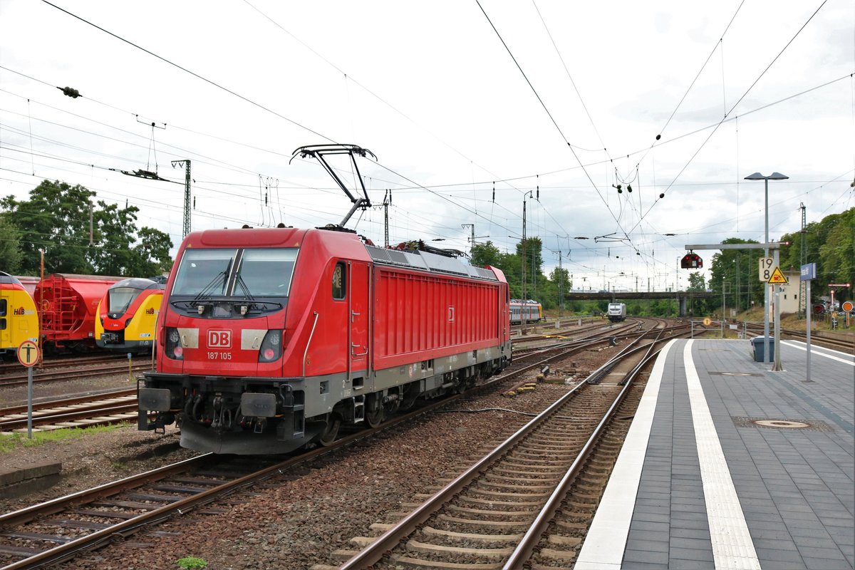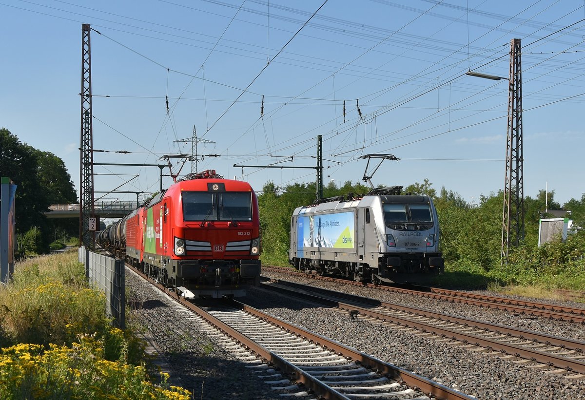Schmanckerl der dritten Art, 192 312 mit einer unbekannten kalten 189 als Wagenlok im Schlepp und einem Mischer kommen hier der im Abstellgleis befindlichen 187 006-2 der BLS Cargo in Lintorf am Abend des 3.7.2018 entgegen auf ihrem Weg gen Süden.