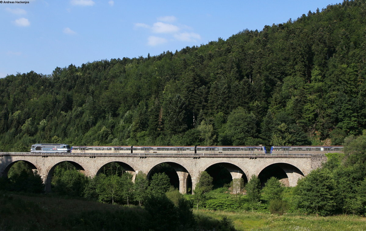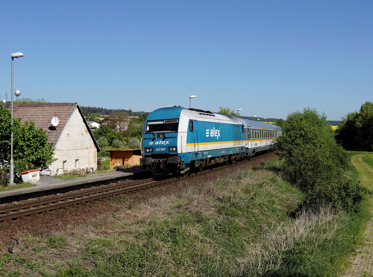 Die 223 067 mit einem ALX nach München am 06.05.2018 bei der Durchfahrt in Milavče.