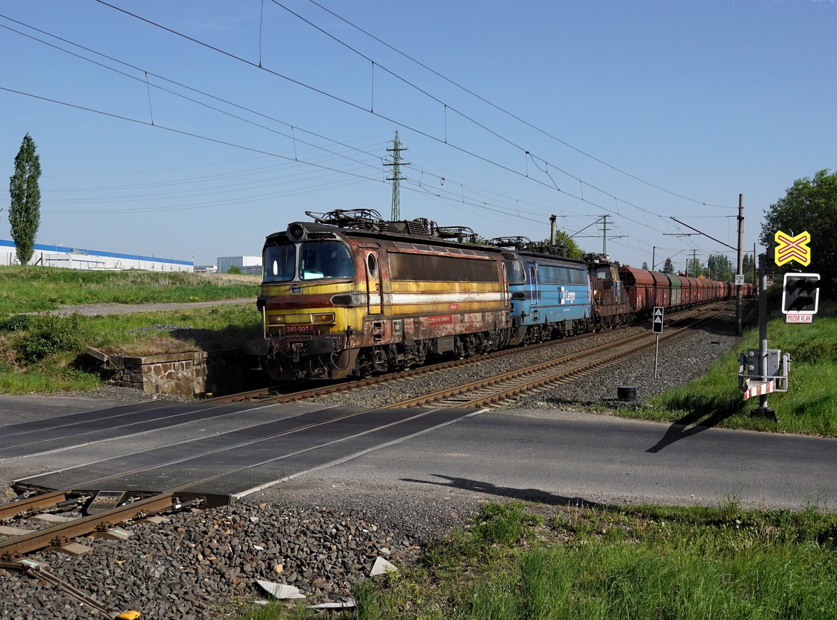 Die 240 007, die 240 008 und die 210 054 mit einem Kohlezug am 05.05.2018 unterwegs bei Cheb.