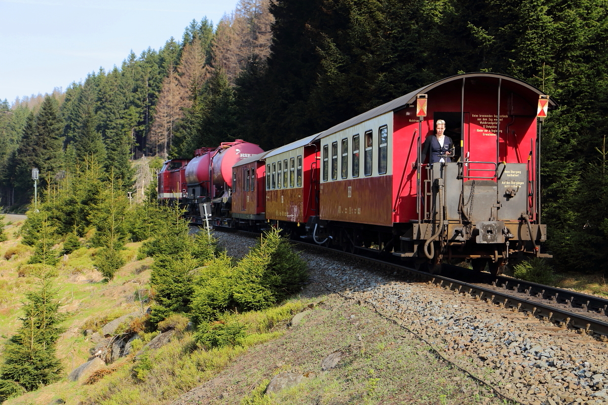 Nach erfolgter Scheinanfahrt wird der Sonder-GmP am 21 04.2018 in Höhe Bahnübergang Brockenstraße von unserer Zugführerin nun per Sprechfunk zurückgelotst, damit die Foto- und Filmfreunde wieder einsteigen können.