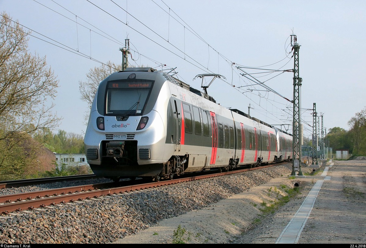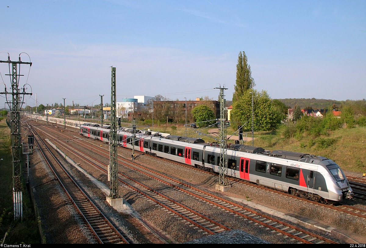 Nachschuss auf 9442 ??? (Bombardier Talent 2) von Abellio Rail Mitteldeutschland als RE 74571 (RE16) von Erfurt Hbf nach Halle(Saale)Hbf, der in Halle-Ammendorf auf der Bahnstrecke Halle–Bebra (KBS 580) fährt. Aufgenommen von der Brücke Hohe Straße. [22.4.2018 | 17:53 Uhr]