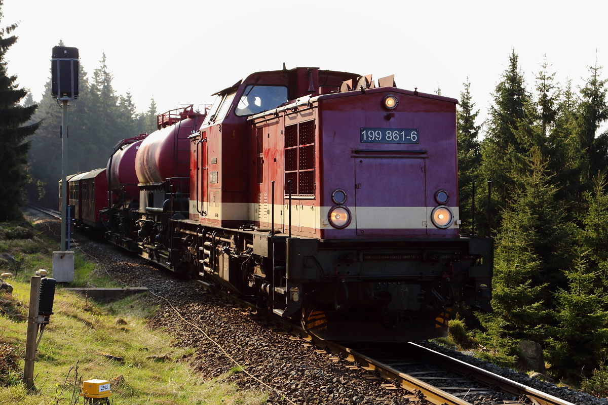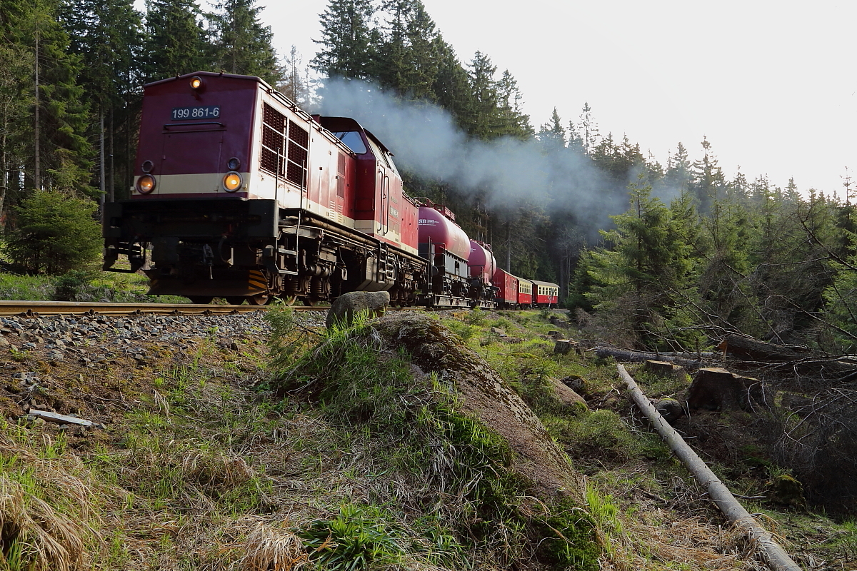 Einen weiteren Fotostopp gab es für 199 861 mit ihrem Sonder-GmP am 21.04.2018 beim Heinrichshöhemoor, kurz vor Erreichen des Brockenbahnhofes. Das Bild aus etwas ungewöhnlicher Perspektive, entstand nach dem Aussteigen des Fotografen auf dem Weg zum vorgesehenen Aufnahmestandort.