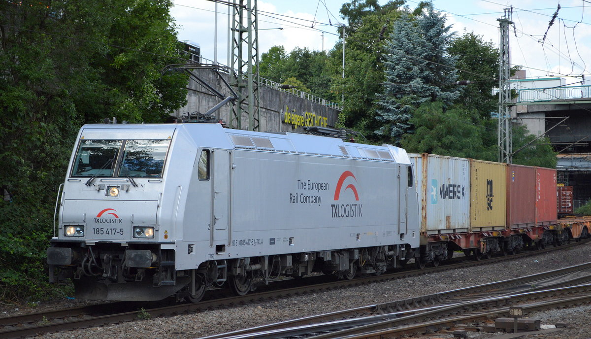 TX Logistik Austria GmbH mit "185 417-5" [NVR-Number: 91 81 0185 417-5 A-TXLA] und Containerzug verlässt den Hamburger Hafen, 30.06.18 Bf. Hamburg-Harburg.