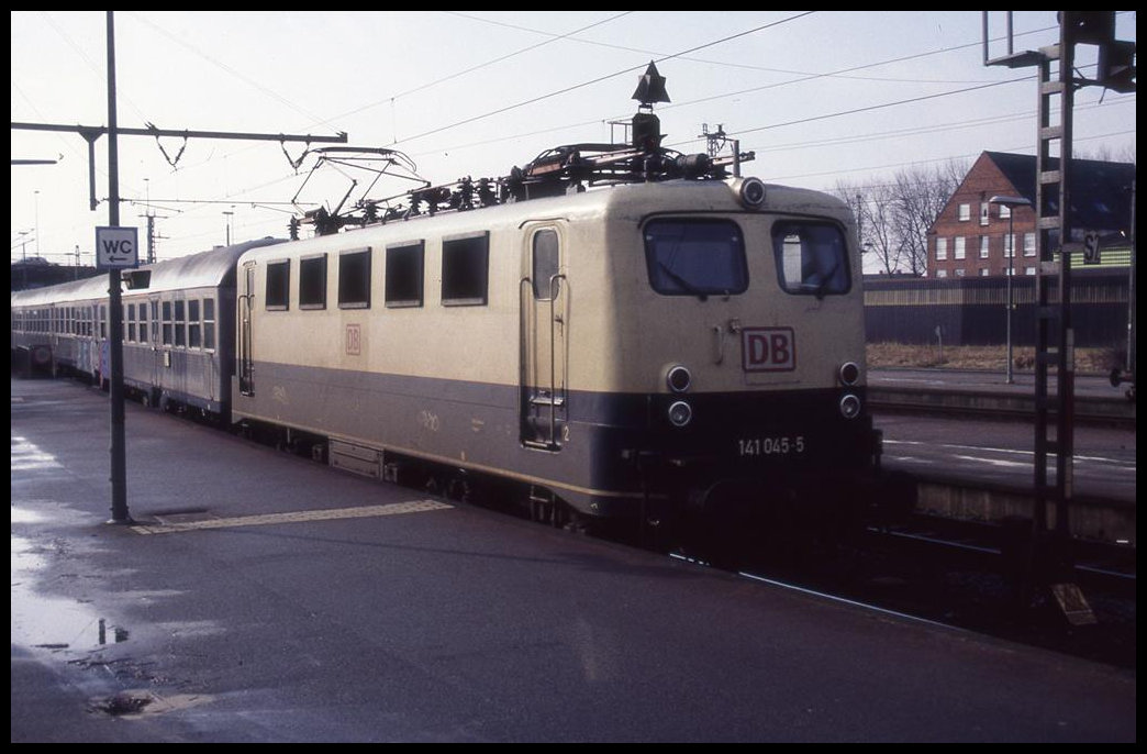 141045 am 18.2.1995 vor einem Nahverkehrszug im HBF Emden.